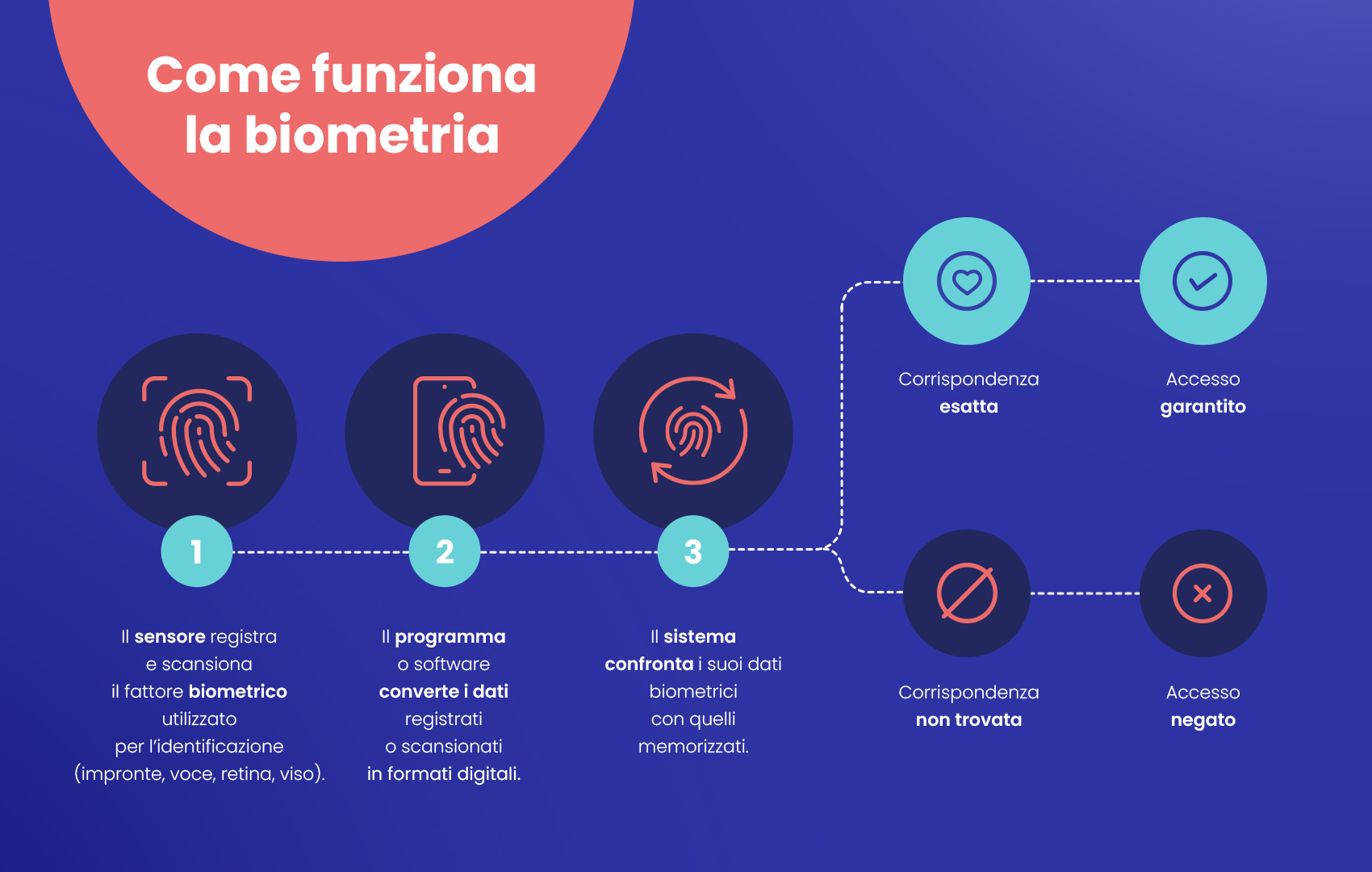 L’autenticazione biometrica si basa sugli aspetti fisiologici che rendono unico un individuo. Cosa vuol dire? Che password e codici possono essere facilmente condivisi o copiati, ma rubare i dati biometrici di un’altra persona è praticamente impossibile.