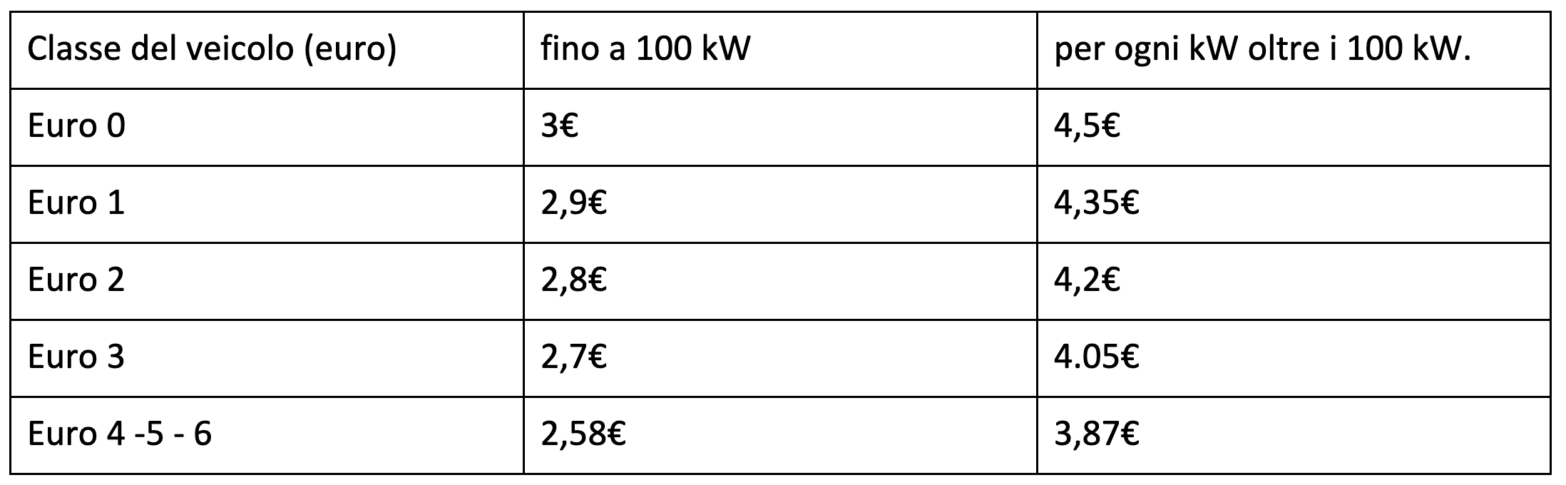 Il calcolo pratico dell'importo dovuto si effettua moltiplicando la potenza del veicolo espressa in kilowatt per la tariffa unitaria corrispondente alla classe Euro di appartenenza e alla Regione di residenza.